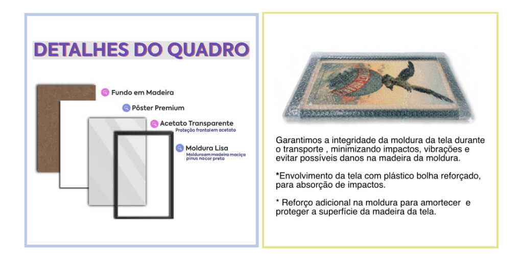 - O pôster é enviado em uma moldura de madeira maciça pinus na cor preta, com gancho móvel para fixação na parede, podendo ser pendurado tanto na horizontal quanto na vertical. A proteção frontal é em acetato, evitando o uso de vidro.
